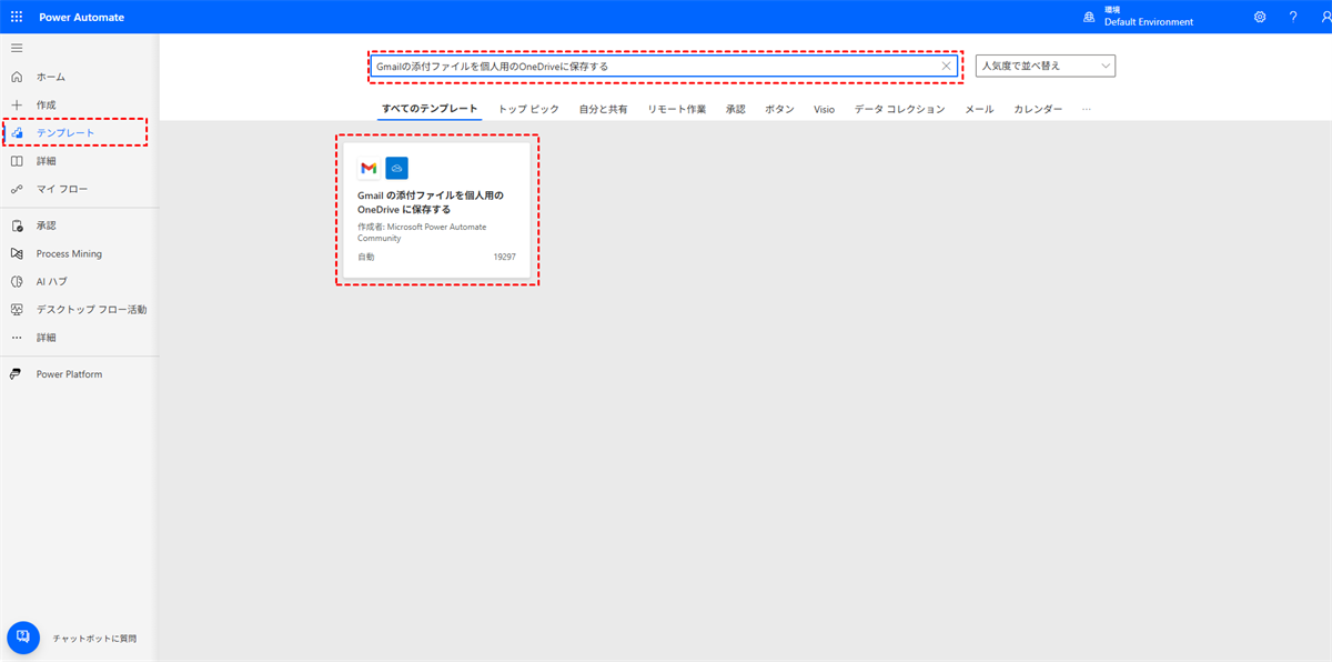 ステップ 1:Power Automateのウェブサイトにアクセスし、「Gmailの添付ファイルを個人用のOneDriveに保存する」というテンプレートを検索します。