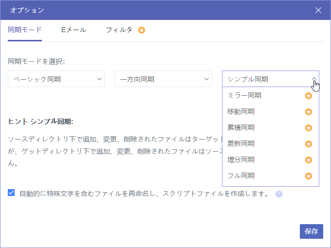 - コンテンツ全体ではなく、ドキュメント、写真、ビデオのみを同期したい場合はフィルタ機能を利用して、ファイル拡張子を追加することができます。