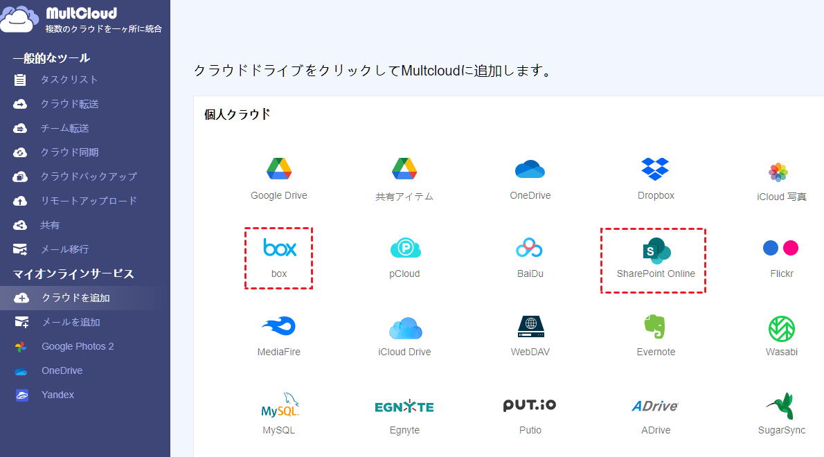 ステップ 2. SharePoint Onlineアカウント&Box Businessアカウントにログインし、それらを「MultCloud」に追加します。