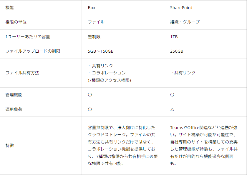 - ストレージ:SharePoint Onlineの容量は契約しているユーザーの数に応じて決まります。基本容量1TBにくわえて、契約人数に10GBかけたものを追加した容量が上限です(容量=基本容量1TB+『ユーザー数に応じた追加容量10GB×ユーザー数』)。これ以上の容量が必要になったときは、追加購入も可能です。Boxの場合、どのプランを選んでも、ストレージ容量は無制限となっています。そのため、SharePointとBoxを連携し、ドキュメントをSharePointからBoxと同期させることで、SharePointのストレージ容量を増やすことができます。