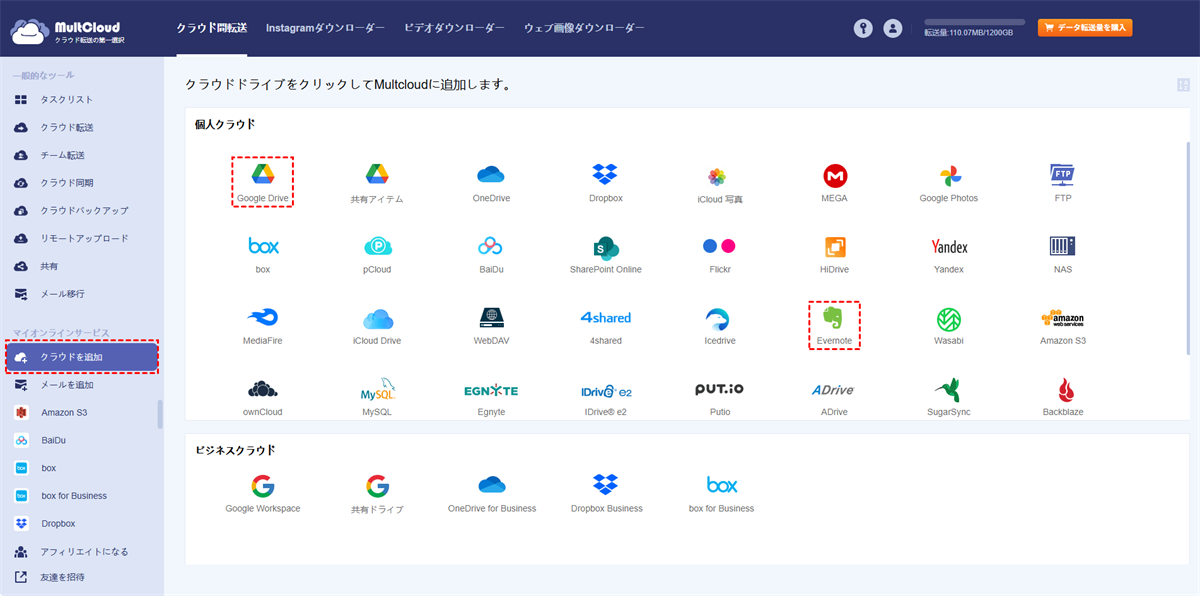 Evernoteは優れたノート作成の助手であり、Googleドライブは共同作業においてほぼ最大のユーザーベースを有しています。MultCloudを利用すればEvernoteとGoogleドライブを同期し、刻々と変化するアイデアをいつでもどこでも素早く他のユーザーと共有することができます。