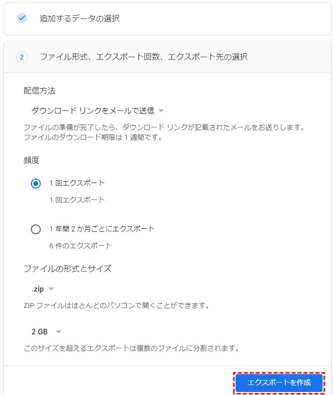 ステップ2:状況に応じて、ファイルの配信方法、頻度、形式とサイズを選択します。そして、「エクスポートを作成」をクリックします。