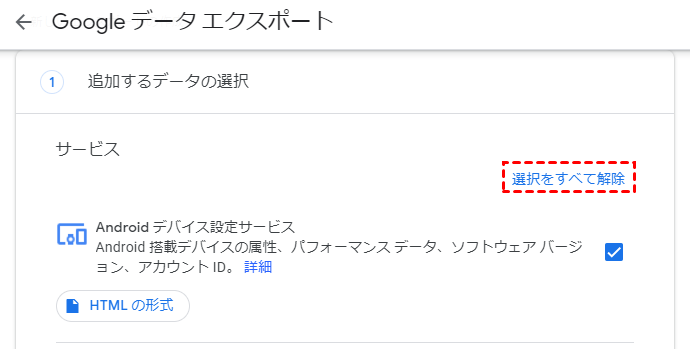 ステップ1:ウェブでGoogleデータエクスポートに向かい、右上にある「選択をすべて解除」します。