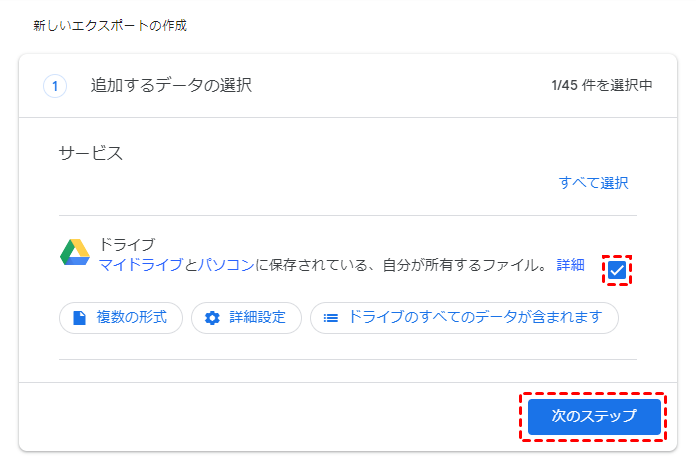 ヒント:Google Takeoutは時々、大容量ファイルをうまくエクスポートできない場合があるため、エクスポートプロセスに注意する必要があります。一方、Googleドライブ上の共有ファイルはエクスポートすることができません。また、共有ファイルを外付けハードドライブに保存したい場合、手動でダウンロードする必要があります。