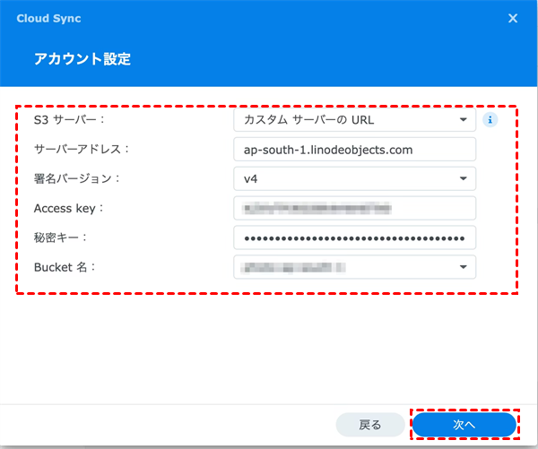ステップ 3:次の画面で、ご自身のS3情報に基づいて空欄を入力します。その後、「次へ」タブを押します。