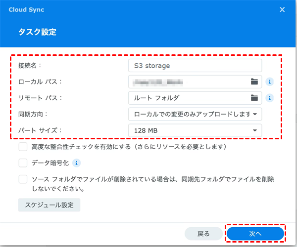 ステップ 4:接続タスクに名前を付けます。次に、「ローカルパス」や「リモートパス」を含む情報を入力します。「同期方向」については、「双方向」を選択することをお勧めします。これにより、選択したSynology NASのファイルが自動的にS3と同期されるようになります。
