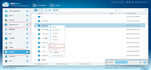 DropboxからAmazon S3などのクラウドにファイルを転送する場合は、「クラウド転送」「コピー先」機能を使うと簡単に実現できます。クラウド転送」では、クラウド間で大量のファイルを一度に転送することができ、「コピー先」では、クラウド間でコピーするファイルを1つまたは数個選択することができます。