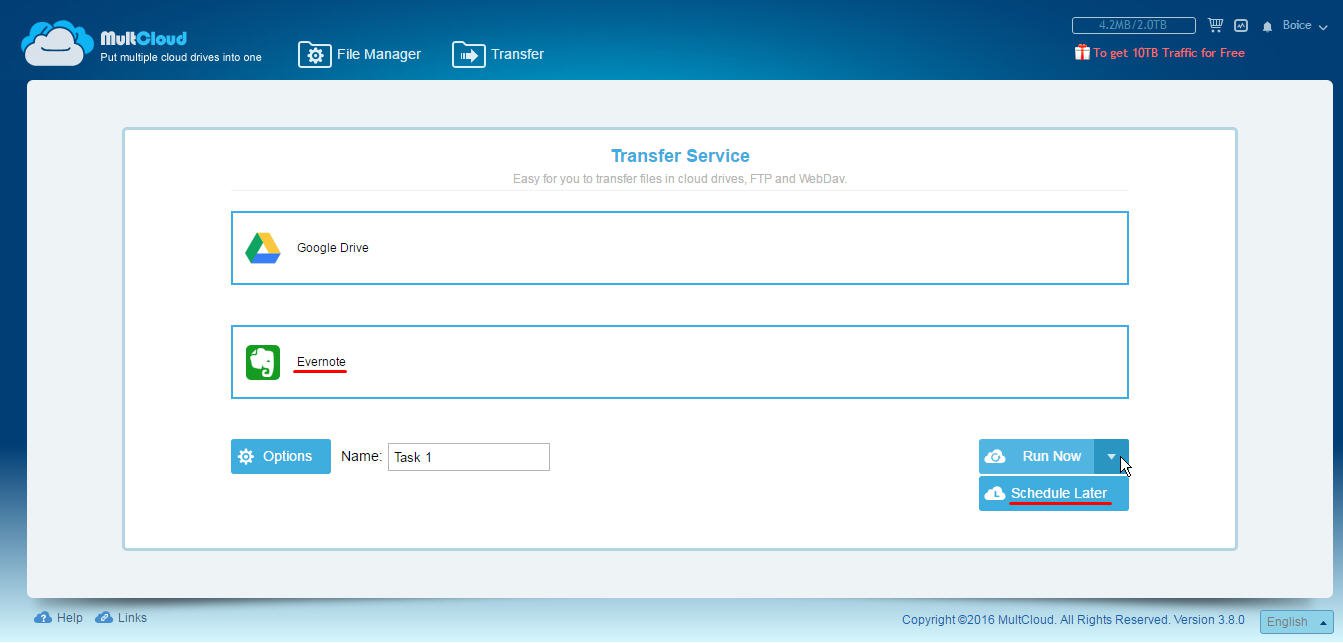 MultCloudが対応するクラウドサービス:Dropbox、Evernote、Amazon Cloud Drive、Amazon S3、WebDav、Google Drive、Box、SugarSync、CloudMe、Cubby、MyDrive、WEB.DE、Yandex、Hidrive、BaiDu、MediaFire、ownCloud、Alfresco、ADrive、Hubic、MySQL、MEGA、FTP/SFTP