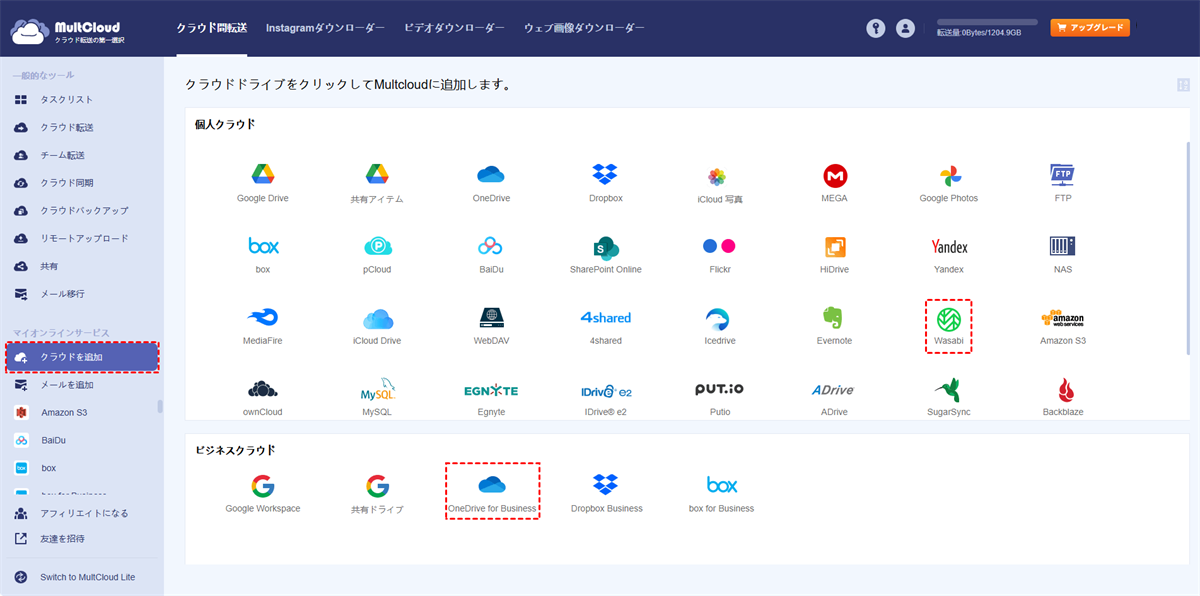 ステップ 2. 「クラウドを追加」ボタンをクリックして、OneDrive for BusinessとWasabiアカウントをそれぞれMultCloudに追加します。