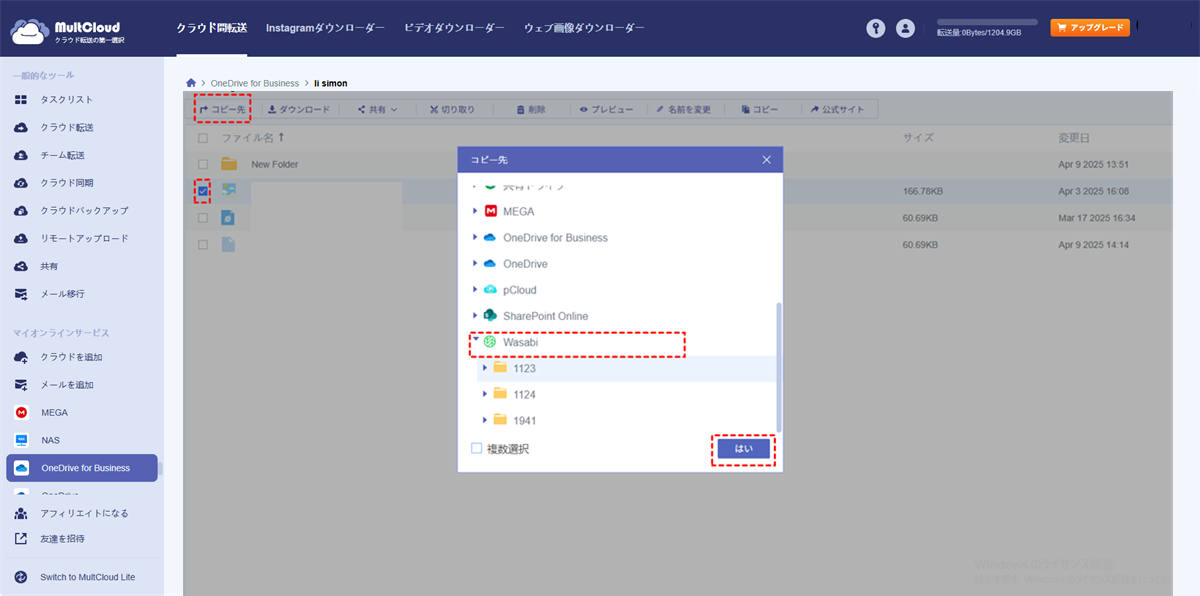 方法2. 「コピー先」でOneDrive for BusinessからWasabiへファイルをコピー