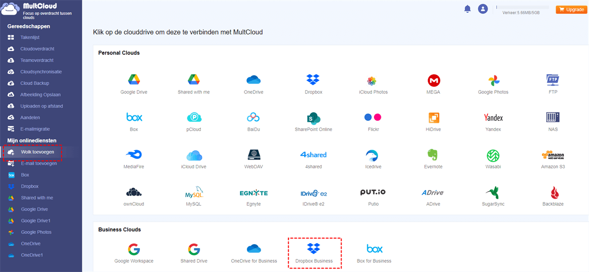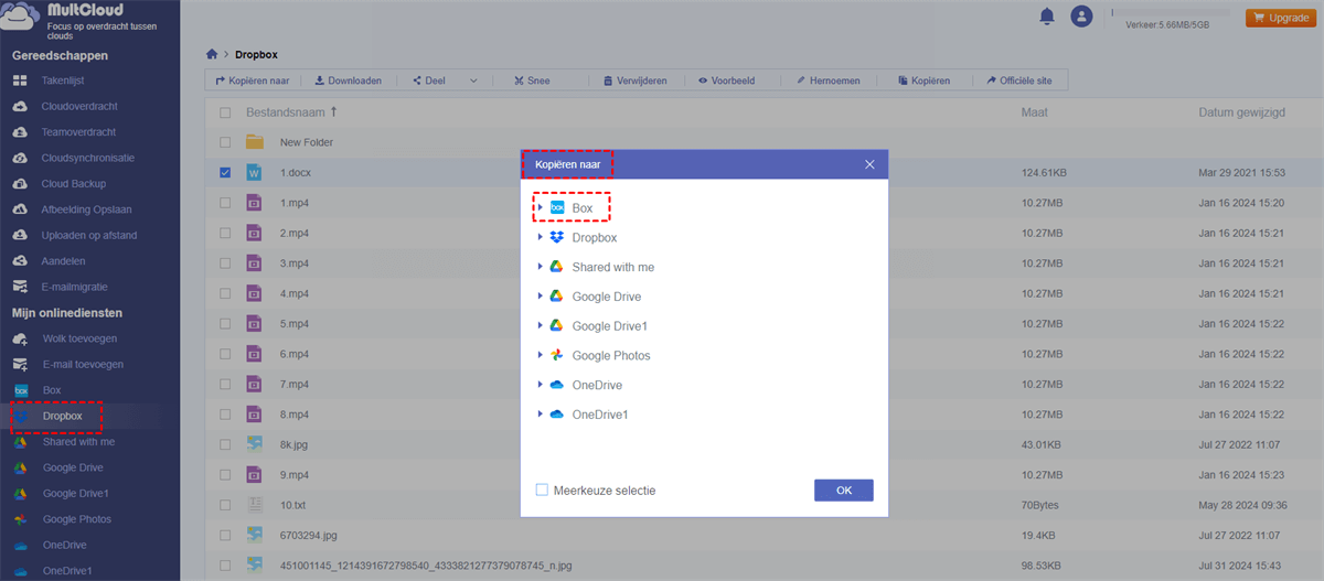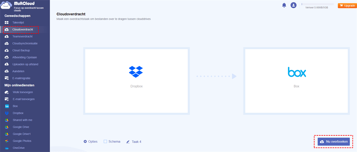 In tegenstelling tot download- en uploadbewerkingen, stelt MultCloud u in staat om over te dragen tussen Dropbox en Box vanaf één platform zonder meerdere vensters tegelijkertijd te openen. Deze methode kan u veel tijd besparen omdat u de inhoud niet eerst van Dropbox hoeft te downloaden en vervolgens naar Box hoeft te uploaden. Al het werk wordt gedaan op één pagina met de MultCloud-website geopend.