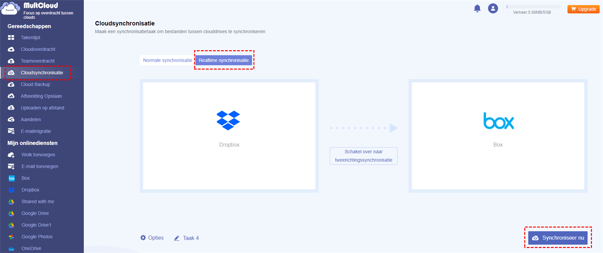 1. Ga naar Cloudsynchronisatie > Realtime synchronisatie nadat u Dropbox en Box hebt toegevoegd.