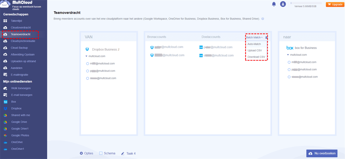 Soms moet u mogelijk bestanden verplaatsen van Dropbox Business naar Box for Business voor een eenvoudige organisatiebeheer. De Teamoverdracht van MultCloud kan uw beste keuze zijn, omdat het u in staat stelt om bestanden naadloos te migreren van alle accounts binnen Dropbox Business naar de gekoppelde accounts in Box for Business die u eerder heeft ingesteld.