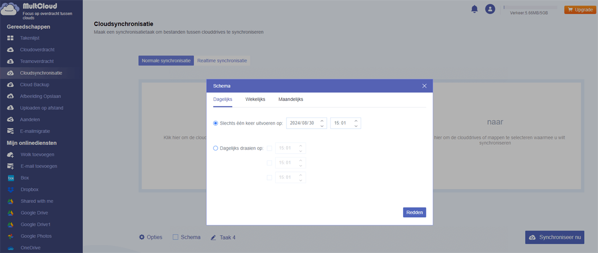 Daarom kunt u vertrouwen op de "Cloudsynchronisatie" functie van MultCloud. Hiermee kunt u gegevens tussen clouds synchroniseren met 10 verschillende synchronisatiemodi. Of u nu alle bestanden of bestanden in een bepaalde map van de ene cloud naar de andere wilt synchroniseren, het kan u goed van dienst zijn. Bovendien, als u regelmatig Dropbox en Box gegevens moet synchroniseren, kunt u een schema instellen om automatisch te synchroniseren op een specifiek tijdstip of met regelmatige tussenpozen.