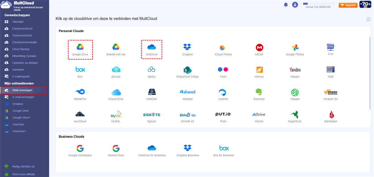 MultCloud, een gratis beheerder van meerdere cloudopslag, biedt een gemakkelijke manier om bestanden van de ene cloud naar de andere over te zetten. Met slechts een paar klikken kunt u de bestanden en mappen selecteren die u wilt en ze snel overzetten. Niet alleen dat, u kunt ook het hele cloudaccount selecteren om al uw bestanden automatisch naar een andere cloudopslagdienst over te zetten. Door op deze manier clouds te beheren, blijven uw bestanden net zo goed georganiseerd als in de vorige cloudopslagdienst.