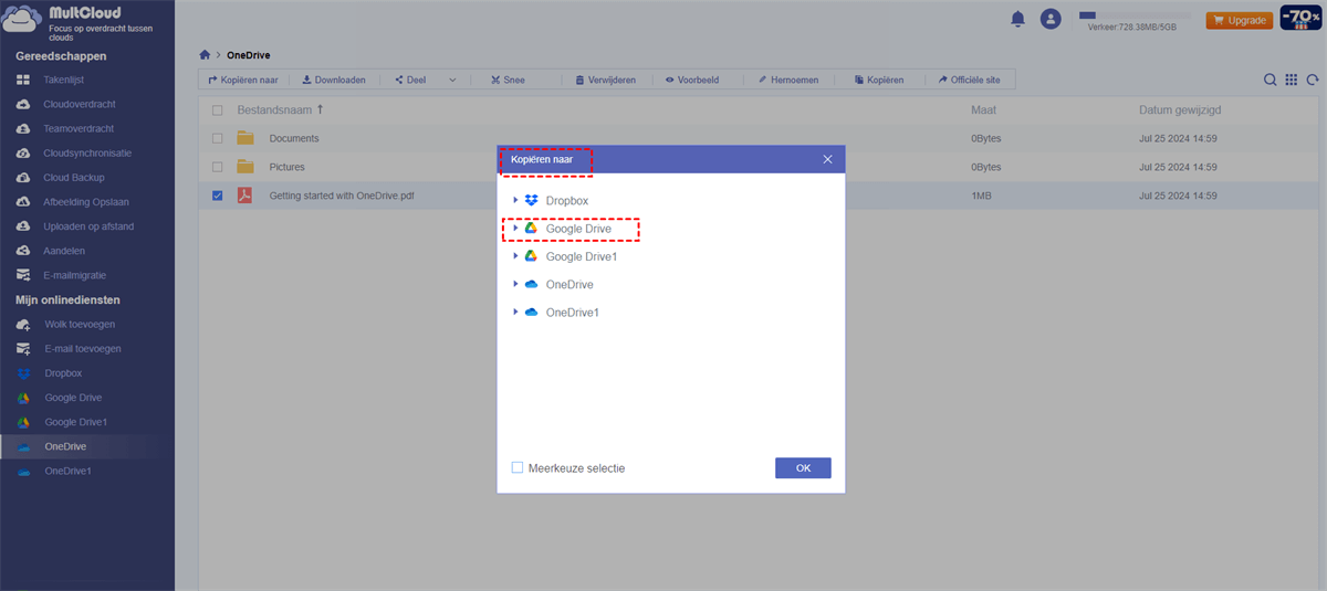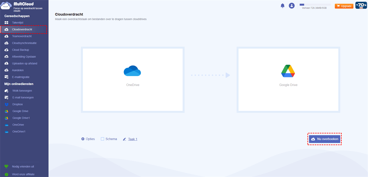 Om een beter inzicht te krijgen in hoe het werkt, nemen we hier de overdracht van OneDrive naar Google Drive als voorbeeld.