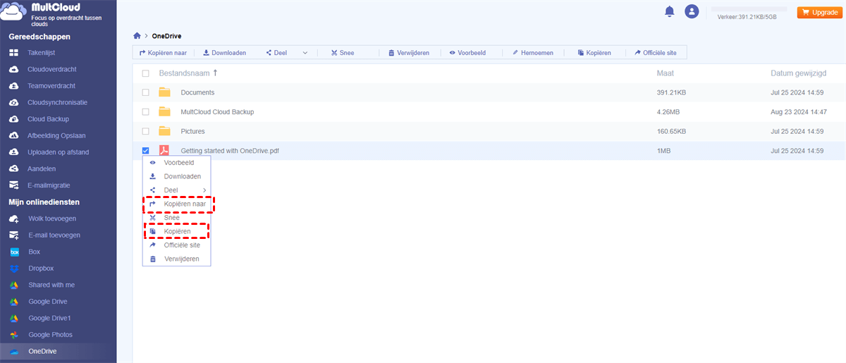 Wanneer alles hierboven is voltooid, kunt u bestanden tussen cloudopslagdiensten verplaatsen met behulp van de functies "Kopiëren" of "Kopieer naar", "Cloudoverdracht" en "Teamoverdracht" in MultCloud.