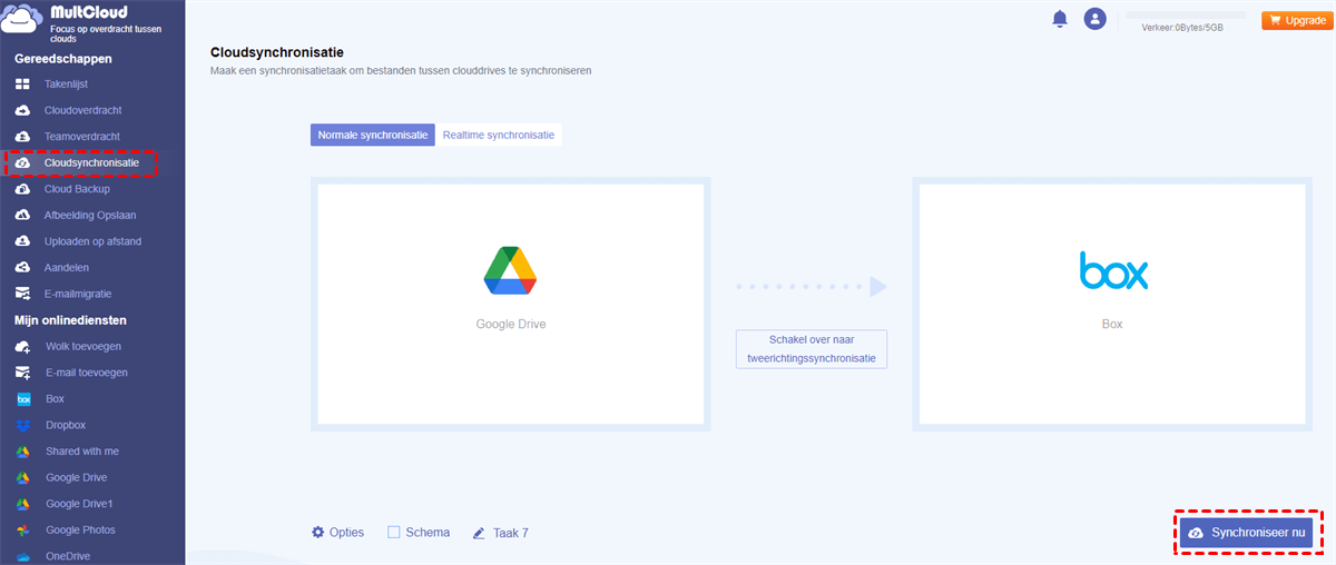Het bovenstaande is hoe je bestanden kunt migreren van Google Drive naar Box. Als je later nieuwe bestanden aan Google Drive toevoegt en deze vervolgens naar Box wilt overzetten, moet je de bovenstaande stappen opnieuw uitvoeren of een andere functie gebruiken genaamd "Cloudsynchronisatie" die wordt aangeboden door MultCloud. Zoals de naam al doet vermoeden, is het om gegevens tussen clouds te synchroniseren. Met zijn hulp worden toegevoegde, verwijderde of gewijzigde bestanden in de bronmap gerepliceerd naar de doelmap. Als je wilt dat de toegevoegde, gewijzigde en verwijderde bestanden in de doelmap ook worden gerepliceerd naar de bronmap, kun je kiezen voor "Tweerichtingssynchronisatie".