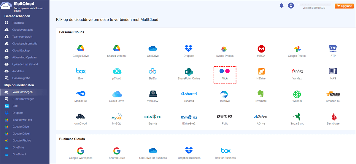 In dit deel vind je eenvoudige manieren om snel Flickr-foto’s naar Google Photos te verplaatsen met behulp van MultCloud, en kies degene die het beste bij je past. Allereerst voeg je Flickr en Google Photos toe aan je account, je ziet beide clouds in de interface van Multcloud. Om foto’s sneller tussen Flickr en Google Photos te migreren, kun je gebruikmaken van verschillende methoden in verschillende situaties met behulp van MultCloud. Verplaats nu Flickr-foto’s naar Google Photos op 2 manieren: