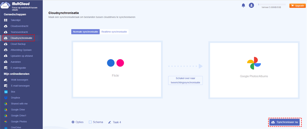 Als je mappen of de hele opslag van Flickr naar Google Photos wilt verplaatsen, kun je de functie "Cloudsynchronisatie" gebruiken om foto’s van Flickr naar Google Photos te synchroniseren.