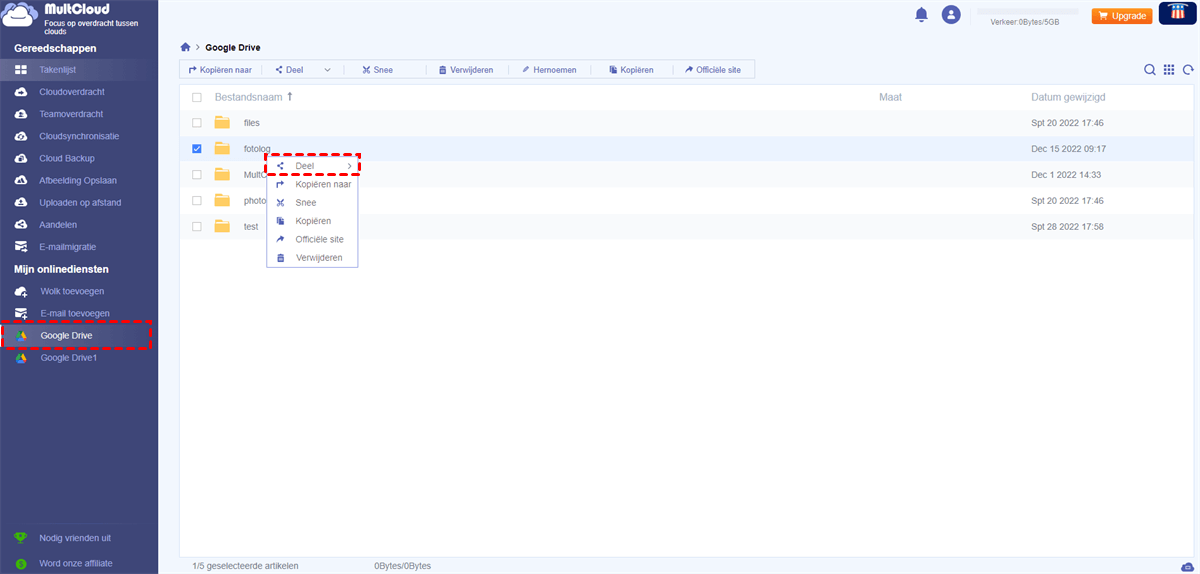 De bovenstaande methode kan de gegevens alleen naar het Google Drive-account van dezelfde gebruiker overzetten. Wanneer de twee Google Drive-accounts niet van dezelfde persoon zijn, bijvoorbeeld als u de privégegevens in uw Google Drive-account met vrienden wilt delen. In deze situatie, hoe zet u gemakkelijk bestanden van de ene Google Drive naar de andere over? Maak u geen zorgen, de "Delen" functie in MultCloud kan u helpen deze taak te voltooien.
