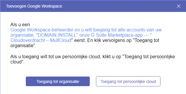- Als u een sub-account bent onder het Google Workspace-beheerdersaccount en gegevens moet overdragen, moet u "Toegang tot Persoonlijke Cloud" selecteren bij het toevoegen van het account.