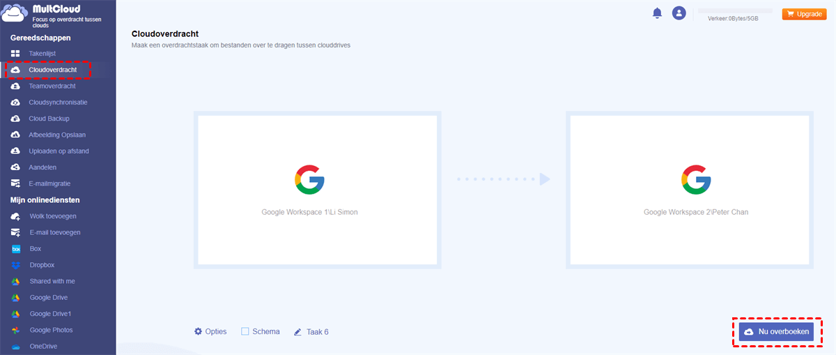- MultCloud kan automatisch gegevens van het ene Google Workspace-account naar het andere overdragen wanneer u een geplande cloudbestandoverdracht instelt in "Schema".