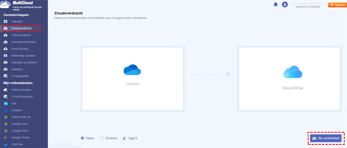 Stap 3: Klik nu op Cloudoverdracht in de linkerzijbalk en kies OneDrive als de bronmap en iCloud Drive als de doelmap. Klik tenslotte op Nu overboeken om de taak te starten.