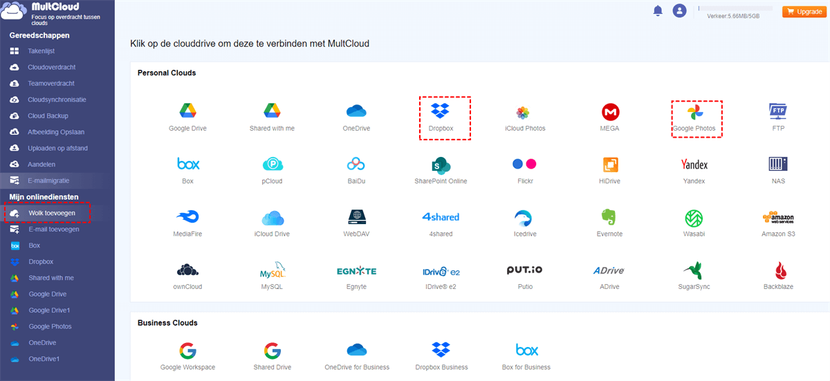 1. Zorg ervoor dat je Dropbox en Google Photos hebt toegevoegd aan MultCloud.