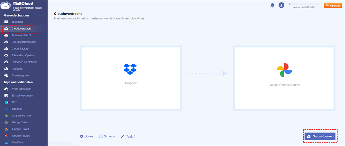 Stap 3. Verplaats foto's van Dropbox naar Google Photos via Cloud Transfer. Klik op de knop "Cloudoverdracht" op het tabblad, selecteer alle Dropbox-foto's als bron en "Albums" onder Google Photos als bestemming. Klik vervolgens op "Nu overboeken" om Dropbox-foto's naar Google Photos te migreren.