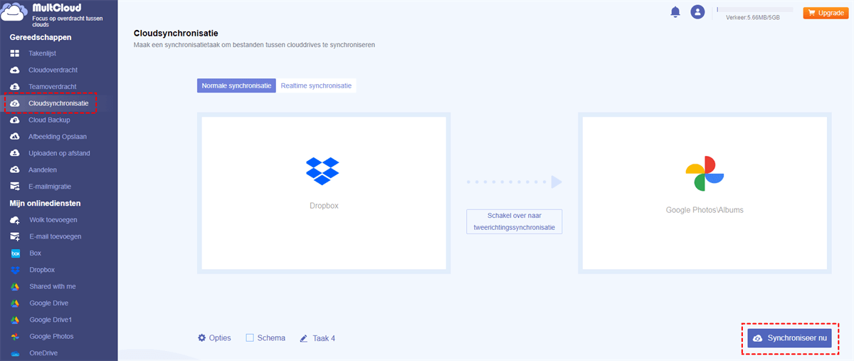 Als je foto's van Dropbox naar Google Photos wilt synchroniseren, probeer dan Cloud Sync. MultCloud biedt 10 synchronisatiemodi, waaronder Tweerichtingssynchronisatie, Synchronisatie in één richting, Realtime synchronisatie, Verplaats synchronisatie, Eenvoudige synchronisatie, Incrementele synchronisatie, Volledige back-upsynchronisatie, Cumulatieve synchronisatie en meer. Hier vind je de eenvoudige stappen om van Dropbox naar Google Photos over te zetten:
