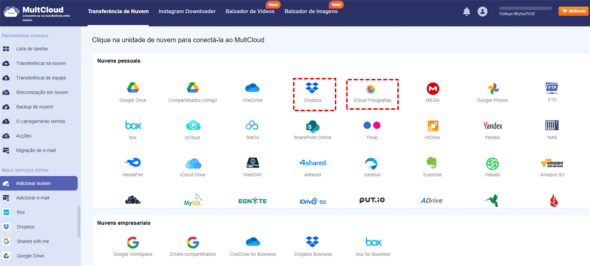 As instruções a seguir podem ser seguidas tanto nos aplicativos móveis quanto no serviço web do MultCloud. Para mostrar como habilitar a sincronização do iCloud Photos e Dropbox, independentemente do dispositivo que você estiver usando, utilizaremos o serviço web do MultCloud como um exemplo breve.