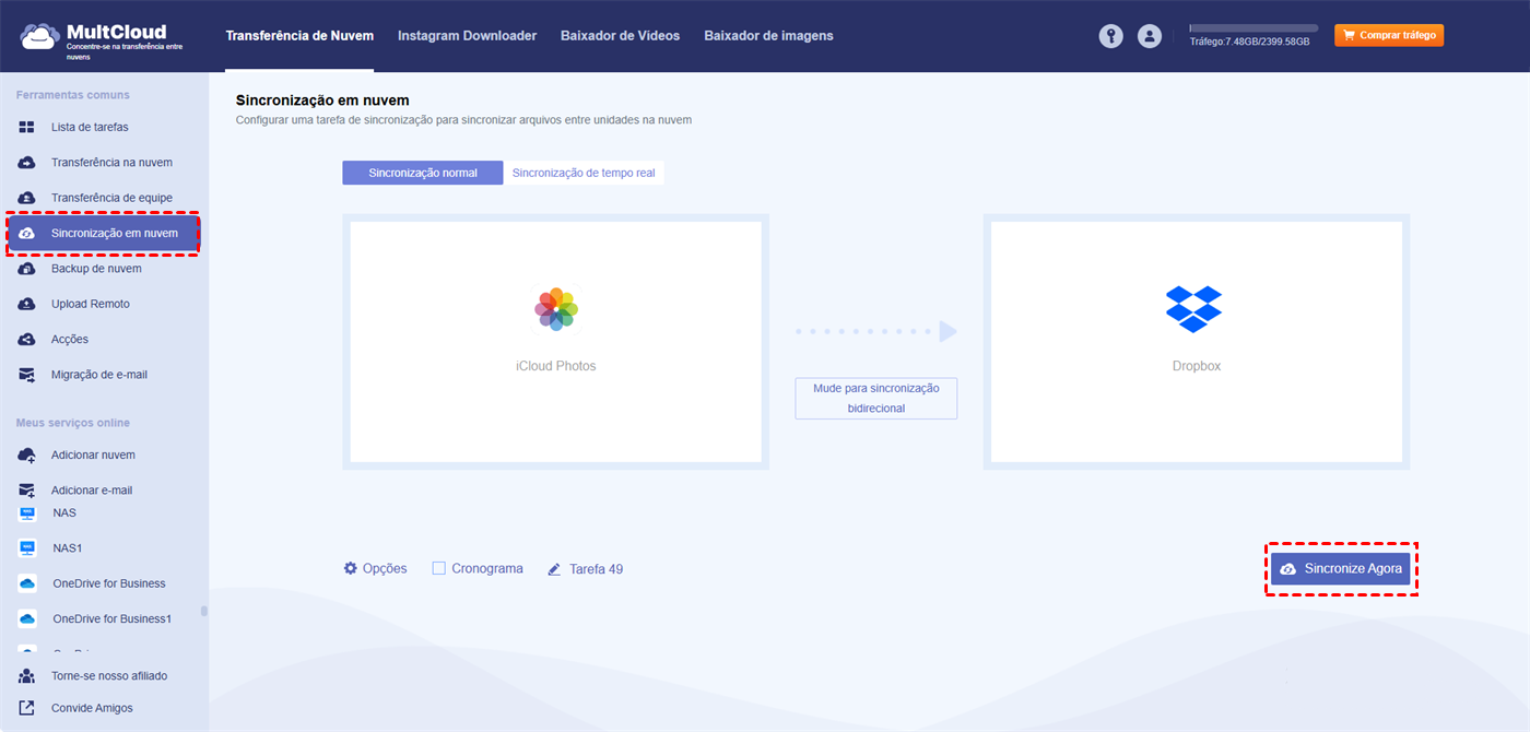 O método acima requer que você instale o aplicativo Dropbox em seu iPhone. E pode ocupar muito espaço no armazenamento do seu iPhone durante a sincronização, já que suas fotos e vídeos do iCloud precisam ser baixados para o iPhone primeiro. No entanto, há uma maneira mais fácil que não exige a instalação de nada nem ocupa qualquer armazenamento local. Tudo que você precisa é de um serviço profissional de sincronização de dados em nuvem, o MultCloud.