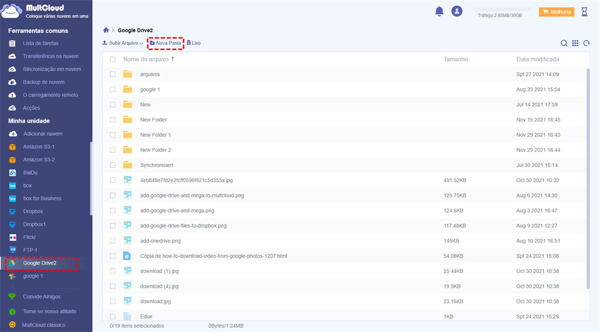 Em comparação com o Google Drive, a página principal de MultCloud é simples e direta, o que é adequada para os usuários. Você não só pode criar pastas aqui, mas também baixar, enviar, transferir e sincronizar arquivos com recuesos de MultCloud.