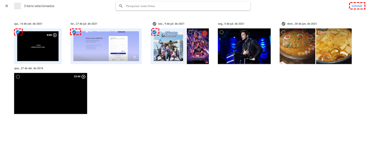 Passo 3: Selecione fotos ou vídeos que você quer esconder, e depois toque em "Concluir" no canto superior direito. Então, todas fotas ocultadas ficam na página de Arquivos.