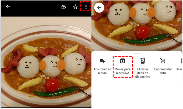 1. Ou, você também pode adicionar foto ao Arquivo selecionando a foto na página inicial, e então clicar em três pontos no canto superior direito para escolher "Arquivar". Desta forma, a foto não será mostrada na página principal do Google Fotos.