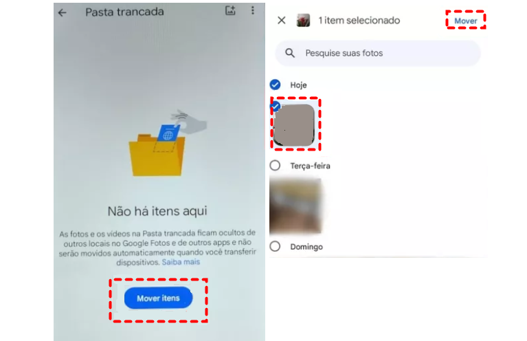 Passo 4: Após criar a Pasta trancada, na prócima página, clique em "Mover itens" e escolher fotos para migrar fotos para pasta trancada. A seguir, toque em “Mover” no canto direito superior.