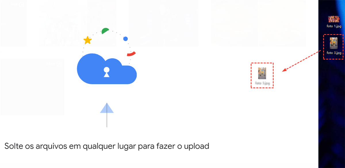 Dica: Você tamém pode arrastar e soltar fotos para enviar fotos para o Google Fotos. Encontre suas fotos no computador a seguir, arraste a foto para interface do site do Google Fotos. Se tem muitas fotos, pressione "CTRL" no teclado constantemente para arrastar muitos fotos para carregar de uma vez.