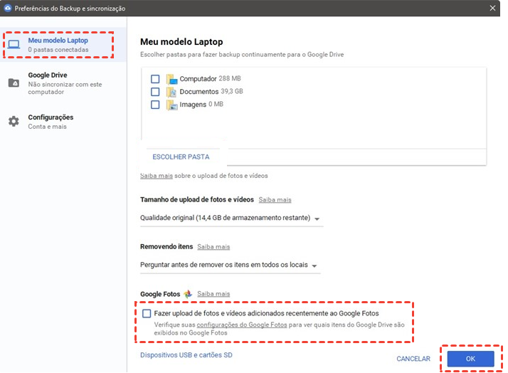 Passo 2: Em “Meu modelo Laptop”, clique em “Fazer upload de fotos e vídeos adicionados recentemente ao Google Fotos” para passar fotos e cilque em "OK".