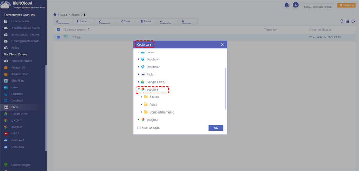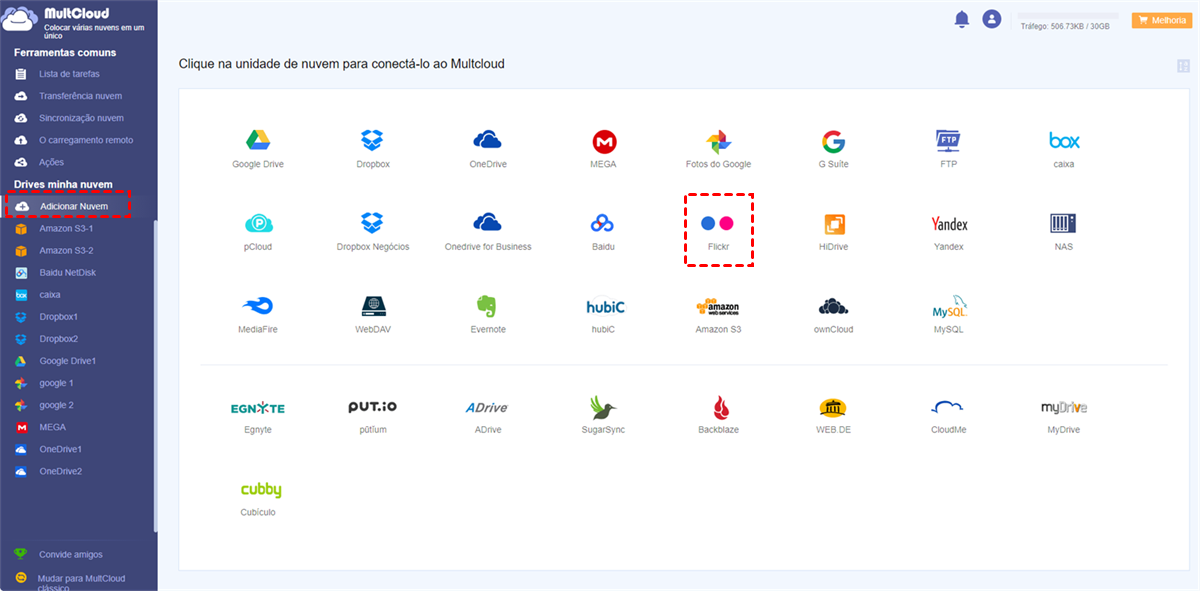 Após adicionar o Flickr e o Google Fotos a MultCloud, pode ver as duas nuvens na interface de Multcloud. Para transferir fotos entre o Flickr e o Google Fotos mais rapidamente, pode usar métodos diferentes de acordo com situações diferentes com a ajuda de MultCloud.