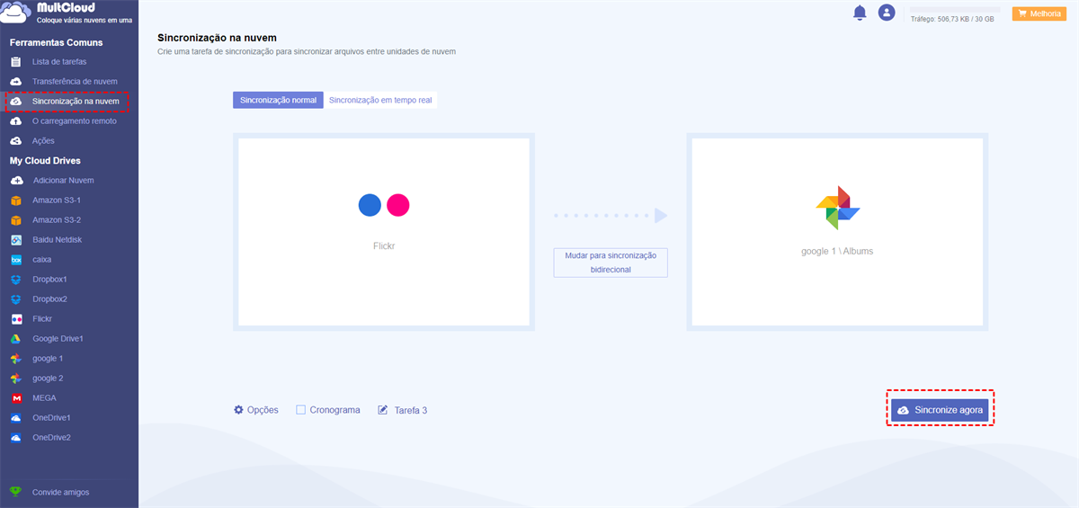 Se quiser mover pastas ou o Flickr inteiro para o Google Fotos, pode usar a função “Sincronização na nuvem” para sincronizar fotos do Flickr para o Google Fotos.