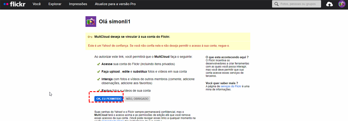 Nota: Se utilizar o seu e-mail para registar o Flickr, uma página vai saltar para pedir uma autorização. Aqui, por favor clique em "OK, EU PERMITIDO".