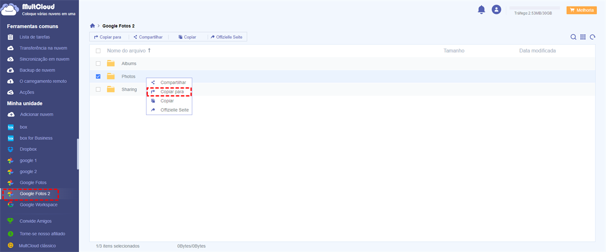 MultCloud é um gerenciador de arquivos de nuvem grátis baseado na web que permite aos usuários sincronizar ou transferir arquivos entre nuvens como Google Drive, OneDrive, MEGA, Box, pCloud, WebDav, servidor FTP, etc., sem upload e download, entrar e sair ou mudar de conta, por isso, é muito fácil transferir dados. Agora vamos ver como transferir as fotos do Google Fotos para outra conta.