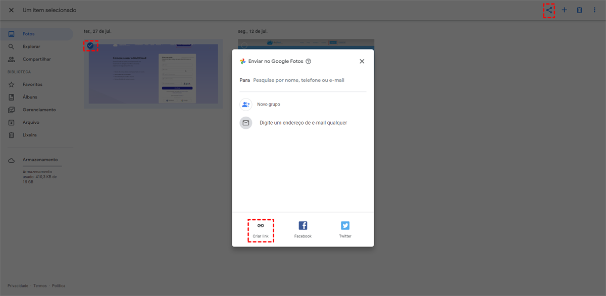 Passo 2. Selecione as fotos que você deseja transferir. Clique no ícone "Compartilhar" localizado no canto superior direito da tela e escolha e selecione a opção "Criar link".