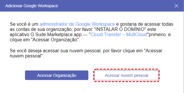 - Se você for uma subconta da conta de administrador do Google Workspace e precisar transferir dados, será necessário selecionar "Acessar nuvem pessoal" ao adicionar a conta.