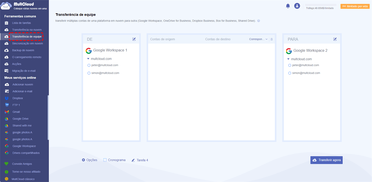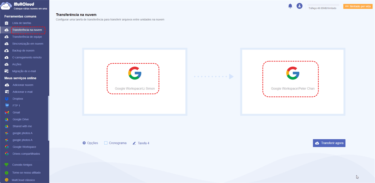 - MultCloud pode transferir dados automaticamente de uma conta do Google Workspace para outra quando você configura uma transferência agendada de arquivos na nuvem em "Cronograma".