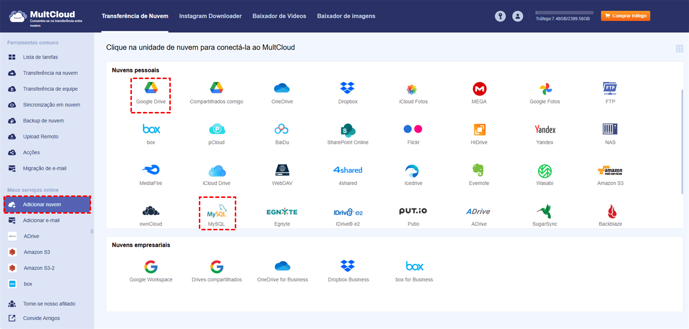Como você pode imaginar, não é eficiente nem conveniente mover manualmente o backup do banco de dados MySQL para o Google Drive, baixando e enviando os arquivos. Mas não se preocupe, testamos um ótimo gerenciador de arquivos em nuvem de terceiros chamado MultCloud, que é profissional e ajuda a fazer o backup automático dos dados do banco de dados MySQL para o Google Drive sem a necessidade de instalação ou compra.