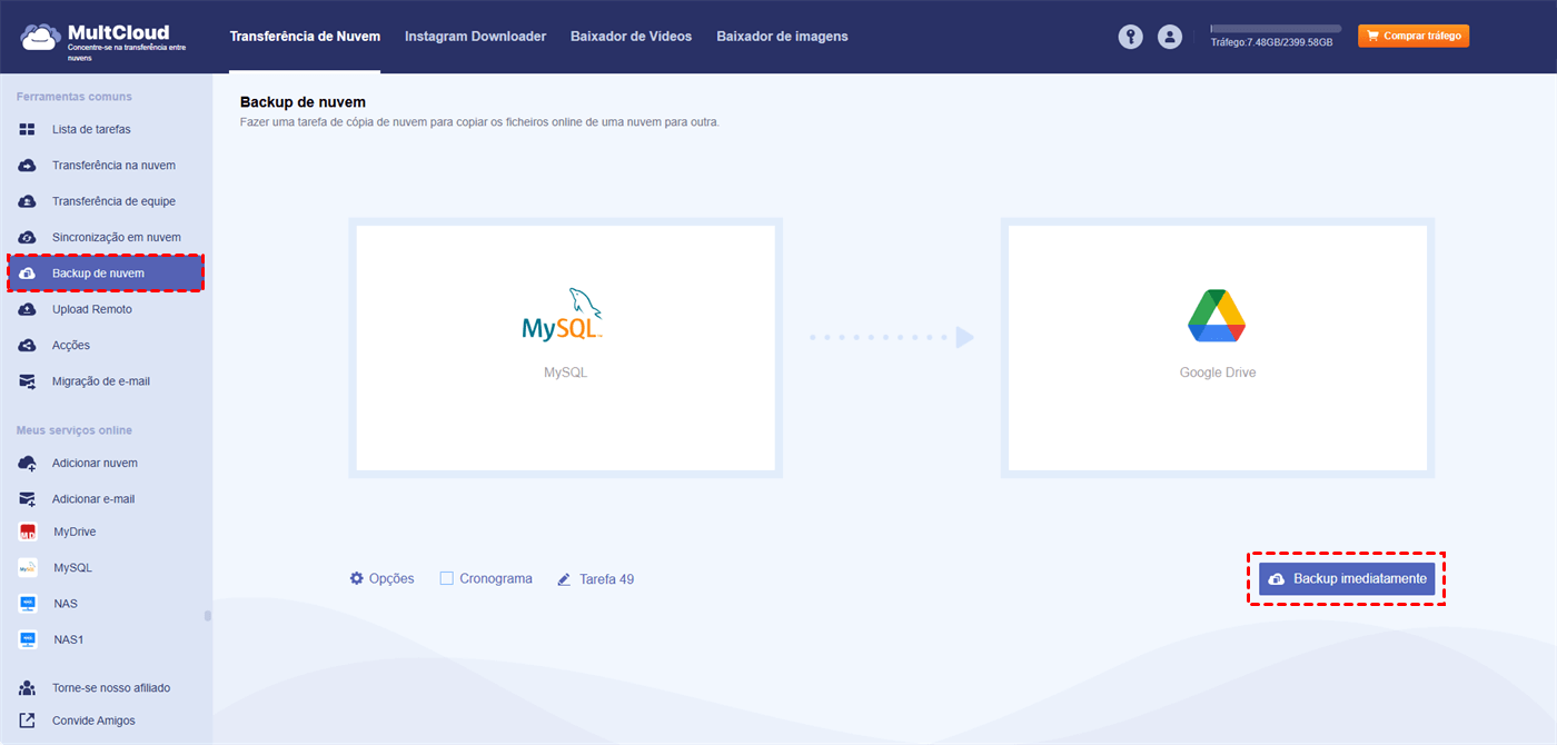 Para fazer o backup automático do MySQL para o Google Drive, a função de Backup de nuvem do MultCloud foi desenvolvida para ajudá-lo.