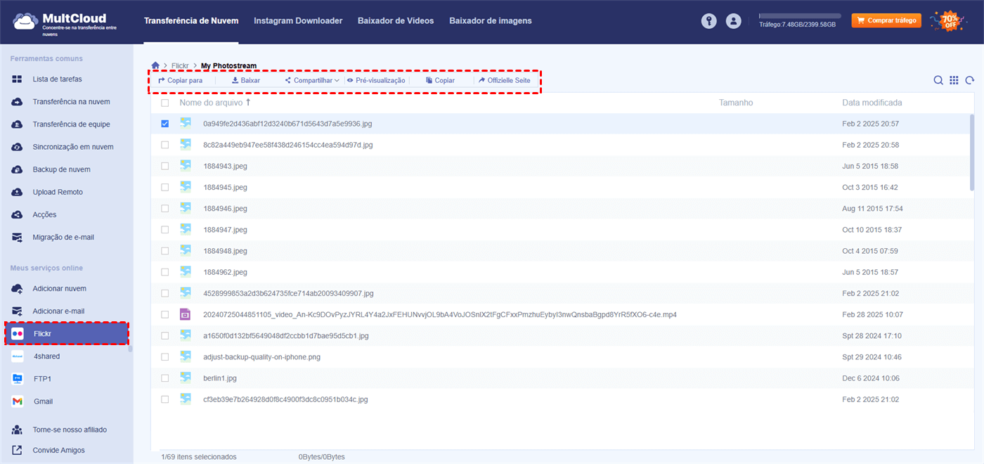 Existe uma solução alternativa para baixar uma foto do Flickr que é por meio do MultCloud. O MultCloud é um gerenciador de armazenamento em nuvem no qual você pode gerenciar todos os arquivos de diferentes unidades de nuvem, incluindo o Flickr. Se você não conseguir baixar uma foto do Flickr em seu site, pode baixá-la no MultCloud. As operações são fáceis de entender.
