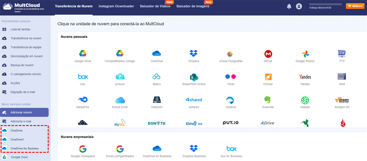 Para reunir várias contas do OneDrive em um só lugar para facilitar o gerenciamento, felizmente, você pode contar com um gerenciador de armazenamento em nuvem múltipla GRATUITO, o MultCloud, que não apenas permite que você acesse todas as suas contas do OneDrive em uma só conta, mas também transfere, faz backup ou sincroniza arquivos entre mais de 30 nuvens líderes diretamente em uma interface.